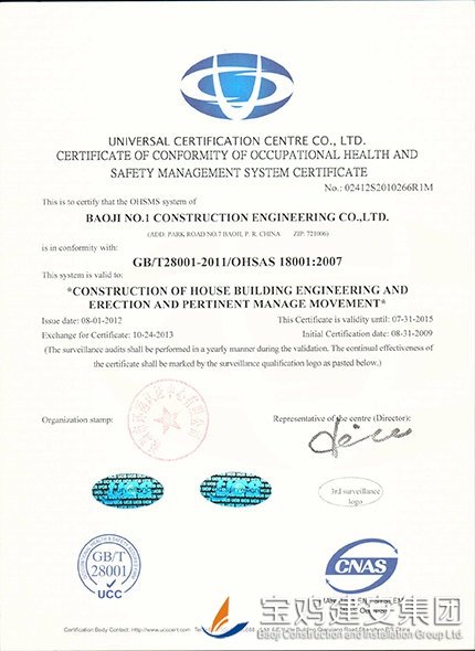 Certificate of Conformity to Occupation Health Safety Management System