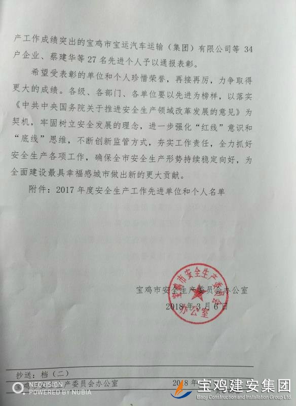 近期,寶雞市安委會對2017年度安全生產先進單位進行了通報,我單位在考核中以優異的成績獲得了此項殊榮。當然,取得這樣的成績,離不開各級領導的正確決策和基層單位的艱辛付出,公司安委會在此表示感謝。 2017年,公司始終圍繞在國家的大政方針框架下,積極展開以《安全生產法》及相關規范標準為核心的安全工作,堅持標本兼治、綜合治理、源頭管控,以遏制安全事故為重點,建立健全安全生產風險分級管控與隱患排查治理雙重機制,持續開展安全生產專項檢查,杜絕了惡性事故的發生。在安全生產標準化建設中,公司始終以“科技創新、合理投入、擇善而從”為出發點進行部署管理,通過系統管理及一系列舉措,使公司安全管理走在本土行業前列,且在多次檢查驗收中,獲得省、市級領導的點贊。 九牛一毫莫自夸 驕傲自滿必翻車,成績只代表過去,2018年,我們要完善不足,戒驕戒躁,砥礪前行。 寶雞建安集團股份有限公司安委會 2018年4月25日