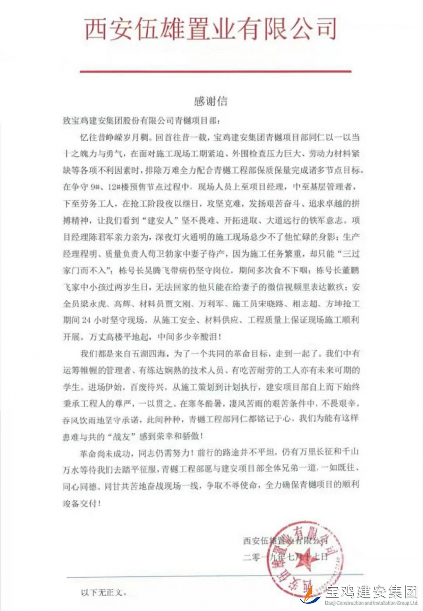 2019年7月17日,我公司路橋項目部承建的中南青樾項目收到由建設單位西安伍雄置業有限公司發出的一封感謝信,信中言辭懇切,對路橋公司青樾項目管理人員給出了極高的評價。在面對施工現場工期緊迫、資金短缺、外圍檢查壓力巨大、勞動力材料緊缺等各項不利因素時,寶雞建安集團青樾項目部各位同仁克服自身困難、艱苦奮斗、不畏艱難以一當十之魄力與勇氣保質保量并按工期節點完成了施工任務。