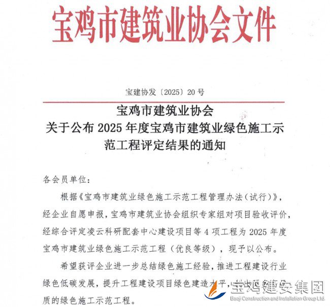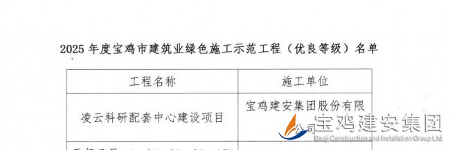 公司承建的凌云科研配套中心建設項目榮膺“2025 年度寶雞市建筑業綠色施工示范工程”稱號