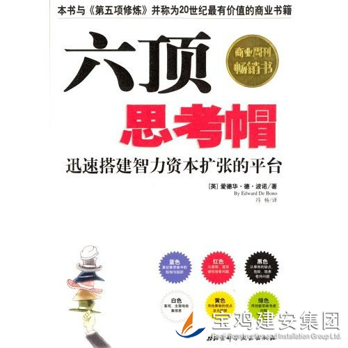 《六頂思考帽》是著名的英國創新思維家愛德華.德.博諾的作品,它通過六種不同顏色詮釋了六種不同的觀點。六頂分別是每個人都認識:藍、白、紅、黃、黑、綠這六種不同的顏色,之所以叫思考帽,是形象地讓人更容易理解和接受,也能夠想象到自己戴上或摘下不同顏色帽子的感受。 藍帽:觀察和管理思考。藍帽負責控制各種思考帽的使用順序,它規劃和管理整個思考過程,并負責做出結論。