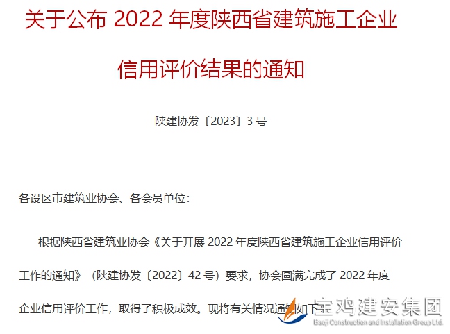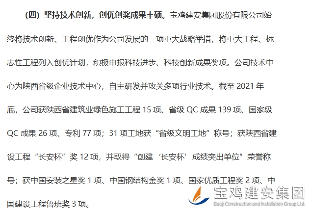 通報文件第二部分對參評企業(yè)特色及亮點(diǎn)進(jìn)行了點(diǎn)名評述,其中第四版塊“堅持技術(shù)創(chuàng)新,創(chuàng)優(yōu)創(chuàng)獎成果豐碩”一欄,對我司進(jìn)行了專門評介:“寶雞建安集團(tuán)股份有限公司始終將技術(shù)創(chuàng)新、工程創(chuàng)優(yōu)作為公司發(fā)展的一項重大戰(zhàn)略舉措,將重大工程、標(biāo)志性工程列入創(chuàng)優(yōu)計劃,積極申報科技進(jìn)步、科技創(chuàng)新成果獎項。公司技術(shù)中心為陜西省級企業(yè)技術(shù)中心,自主研發(fā)并攻關(guān)多項行業(yè)技術(shù)。截至2021年底,公司獲陜西省建筑業(yè)綠色施工工程15項、省級QC成果139項、國家級QC成果26項、專利77項;31項工地獲“省級文明工地”稱號;獲陜西省建設(shè)工程“長安杯”獎12項,并取得“創(chuàng)建‘長安杯’成績突出單位”榮譽(yù)稱號;獲中國安裝之星獎1項、中國鋼結(jié)構(gòu)金獎1項、國家優(yōu)質(zhì)工程獎2項、中國建設(shè)工程魯班獎3項。”