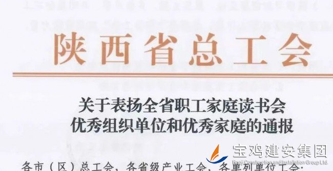 另據消息,在第28個“世界讀書日”到來之際,由市總工會推薦的全市職工讀書活動兩個代表家庭,被陜西省總工會授予全省優秀單位稱號,寶雞建安集團工會成為代表全市職工讀書活動中的典型表率之一,受到全省通報嘉獎,為寶雞贏得了榮譽。