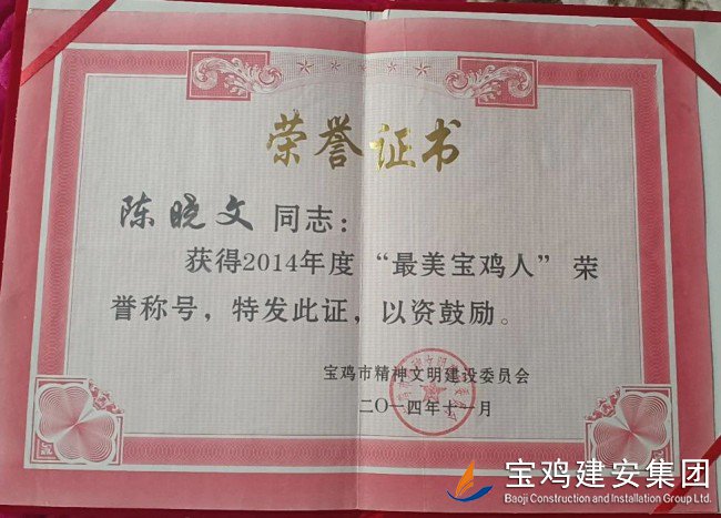 一年一度的“五一”國際勞動節到來之際,從寶雞市總工會傳來喜訊, “2024年度寶雞市五一勞動獎章”先進名單正式確定,我司安裝分公司先后擔任平涼富春園及西寧長島(宗地三十六)項目一期一標段安裝電氣施工員的陳曉文同志榜上有名,受到通報嘉獎! 陳曉文同志,1998年畢業于寶雞技師學院土建專業,作為一名一線員工,多年以來,他深知理論知識的重要性,利用業余閑暇時間,不斷學習土建安裝電氣專業課程。憑借著不懈的努力和刻苦鉆研,他于2015年通過了二級建造師考試,繼而于2020年通過了一級建造師考試,連續取得了機電、市政、公路證書。 陳曉文同志長期工作在施工一線,勤勤懇懇、兢兢業業,以勤奮努力的工作熱忱和扎實細致的工作作風,贏得了公司上下的一致好評,他所帶領的班組2014、2015、2016年連續被評為優秀班組。其本人也曾于2014年被寶雞市文明委授予“最美寶雞人”榮譽稱號。 |